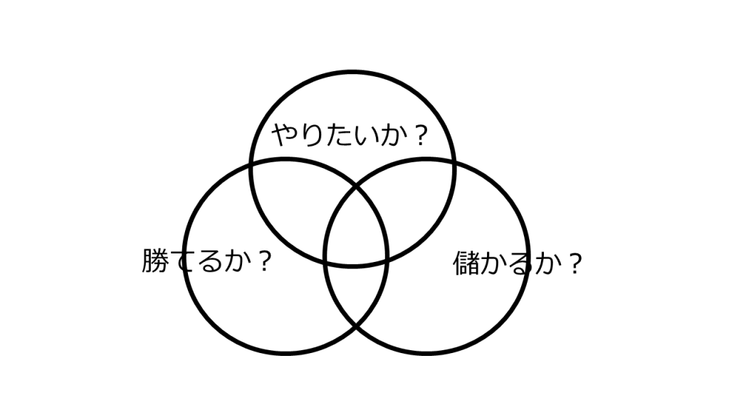 起業にあたって考えることは、ズバリ、「儲かるか、勝てるか、やりたいか」―。そして、この3つの輪の重なり合う領域で事業を進めることが大切だと思います。これは私自身が多くの方に教わり、そして実践してきたことでもあります。